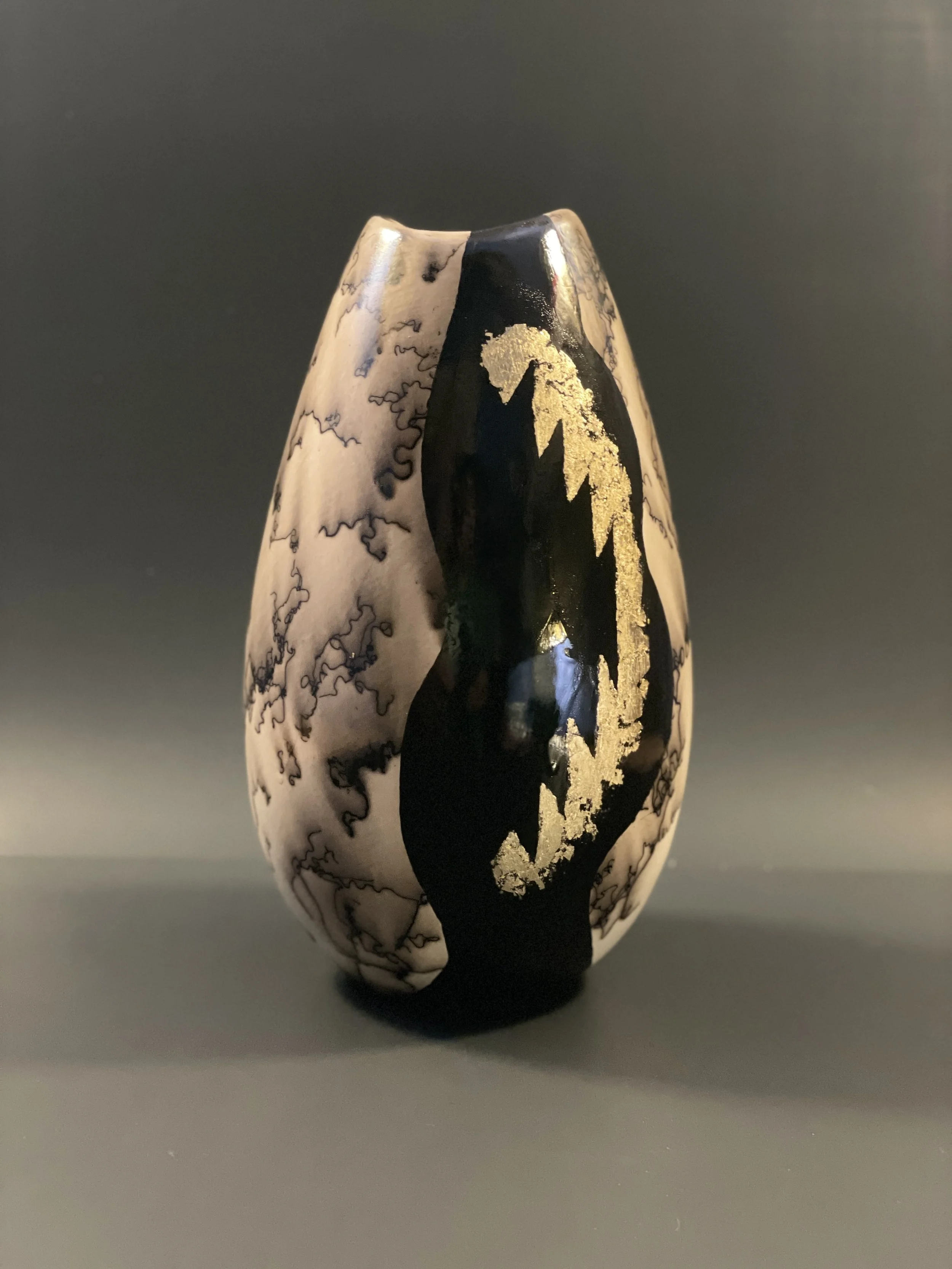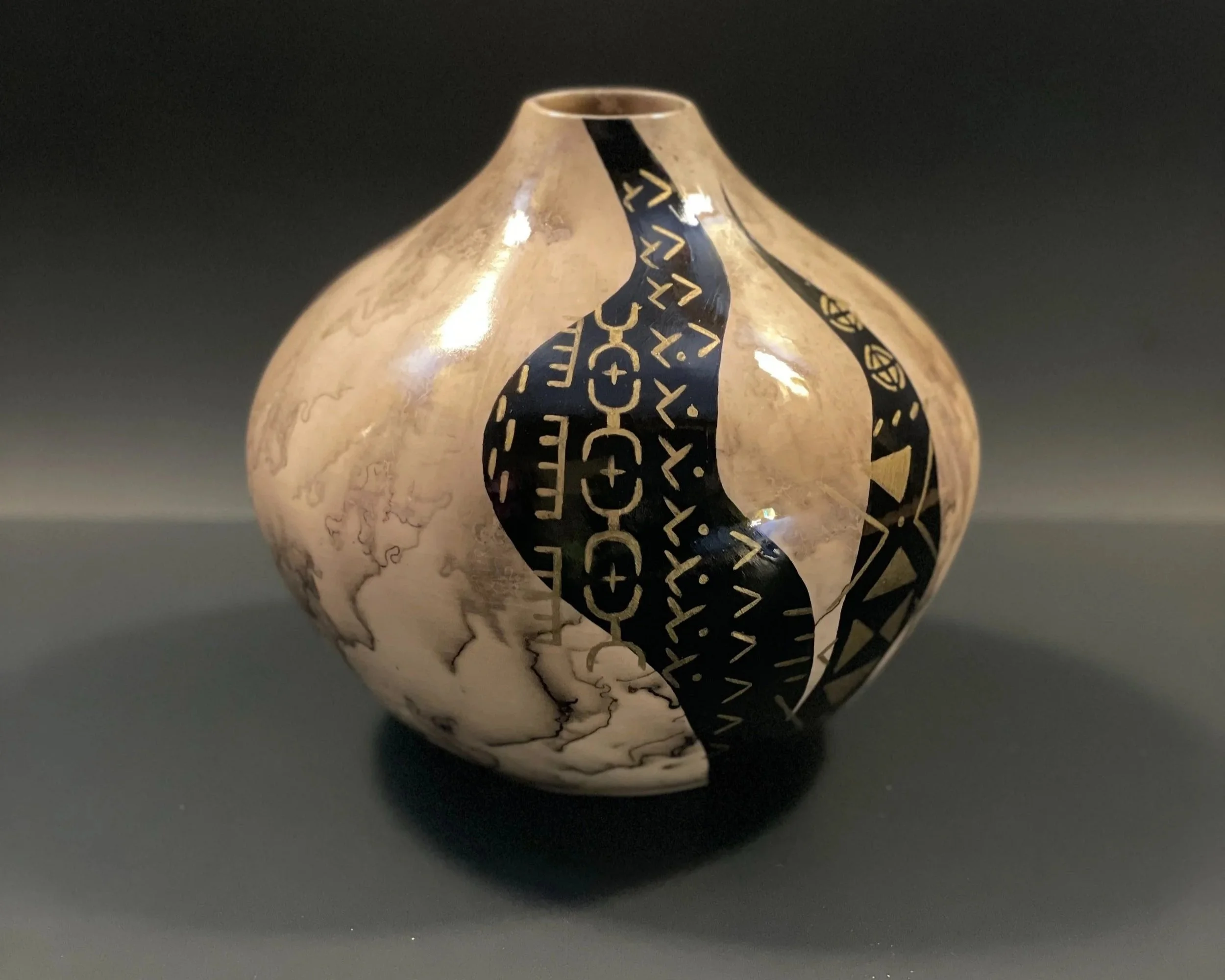 Hand crafted on the Navajo Nation in New Mexico. Each vessel is an embodiment of ancestral wisdom. With clay harvested from New Mexico lands, each vessel is burnished with sacred stones of tourmaline, agate, or quartz, then fired at low temp (Cone- 010), to remain smooth enough for the traditional Navajo Horse Hair Firing process. African mudcloth motifs are then painted or etched onto the surface.